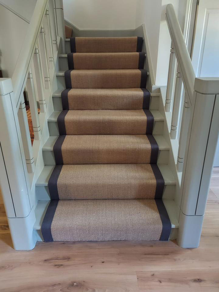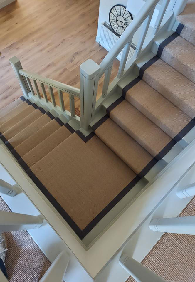 Natural flooring is a great choice for a floor covering as along with its uniqueness it gives a fashionable wow factor that is difficult to achieve with traditional carpets. Also natural flooring is an excellent material to have edged as bespoke rugs or stair runners. Meaning we can create any shape or any size to suit your home. You can see some of our stair runners with trim and full floored carpets pictured below.